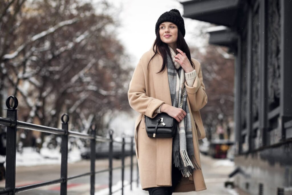 - Contraste clair-obscur : un manteau clair sur une robe sombre (ou vice versa) allongera visuellement votre silhouette
